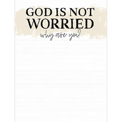 The God Is Not Worried Notepad is a decorative and functional paper pad with a white wood texture design. The notepad reads “God is not worried, why are you?” in black lettering set against a brushed taupe background. This notepad makes a great gift and useful addition to a home, car, desk, or bag. Option to attach a magnet on the cardboard backing to create a fridge or kitchen display. Measures 5.75” high by 4.25” wide.
