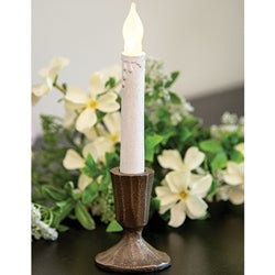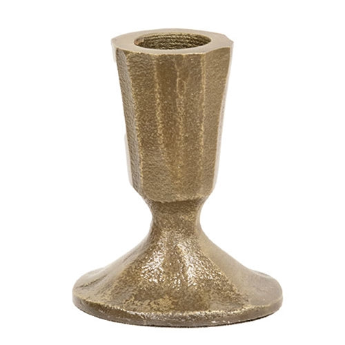 The Gold Painted Cast Iron Taper Holder is a unique and elegant candle holder crafted from cast iron. The taper holder is painted metallic gold and features a rustic textured finish. A flat base allows for stable display on a shelf, tabletop, or windowsill. Measures 3” high by 2.5” wide by 2” deep. Candle not included.