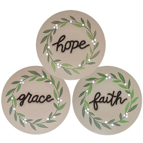 The Grace Faith Hope Plates are an assortment of three decorative lightweight wooden plates with a taupe painted finish. The plates are decorated with painted greenery wreath artwork and feature raised black script lettering, reading “faith”, “hope”, or “love”. Display these plates using a tabletop or wall plate holder, bringing an inspirational and rustic touch to the everyday home. Each plate measures 6.25” in diameter. Please note: This item features a variety of designs which are each sold individually (not as a set).