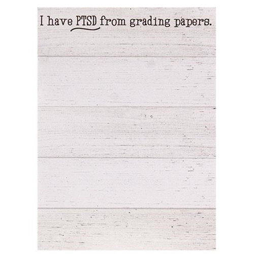 Grading Papers Mini Notepad reads, "I have PTSD from grading papers" in black text over a shiplap-style background. It is made in the USA and features 50 sheets of paper and a magnet on the back and it is perfect for making lists or staying organized on the go. Measures 5.5" high by 4" wide.