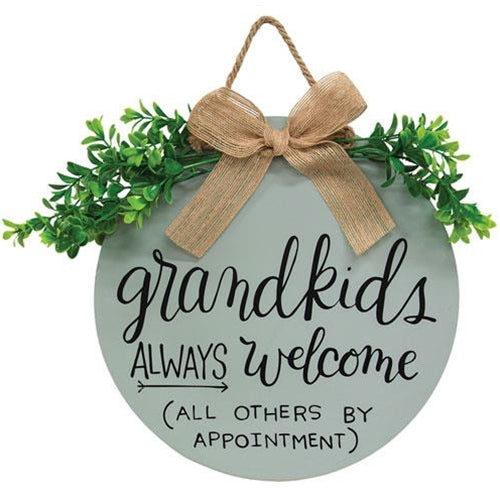 Grandkids Always Welcome Round Sign with Greenery is made of wood and reads, "grandkids always welcome (all others by appointment)" in black text over a light blue background. Sign is round and it is accented with faux greenery and a rustic burlap bow that is perfect for a covered door or entryway. Sign hangs by a jute rope and measures 11.5" in diameter and .25" deep.
