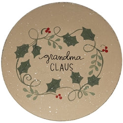 Grandma Claus Plates are decorative plates made from wood in an assortment of 3 seasonal styles. Each plate features hand-painted design and light distressing to complement rustic or farmhouse decor. One plate features a swirling circle of holly and berries around text that reads, "Grandma Claus." One plate features a circle of holly and string lights around text that reads, "grandkids make the holidays brighter." One plate features a circle of poinsettia flowers and leaves around text that reads, "this grandma knows Santa." The plates all feature white speckles on a neutral background. Each measures 6" in diameter by .5" deep. Please note: This Item features a variety of designs which are each sold individually (not as a set). Please add a note in your cart to indicate your preference. If no style is specified, one will be selected at random by our team.