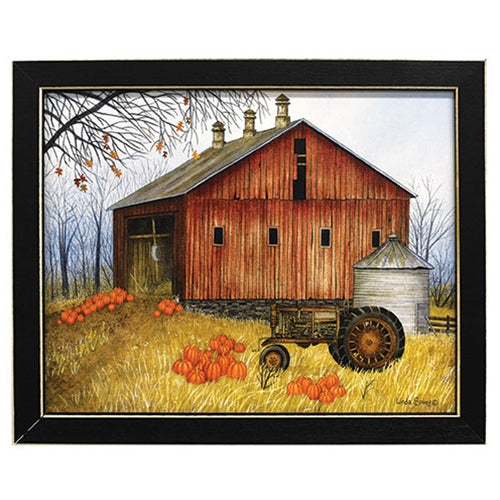 The Grandpa’s Tractor in Fall Framed Print is an Autumnal art piece encased in a black and cream wood frame. The art features an orange painted wood barn with a weathered look, standing in a golden field surrounded by bare trees. Orange pumpkins sit in 4 piles scattered throughout the field. A rustic tractor is shown near the barn along with a weathered white silo. Delicate florals and fall leaves complete the design. The print measures 8” high by 10” wide, and the frame measures 9” high by 11” wide by .5” deep. Made in the USA!