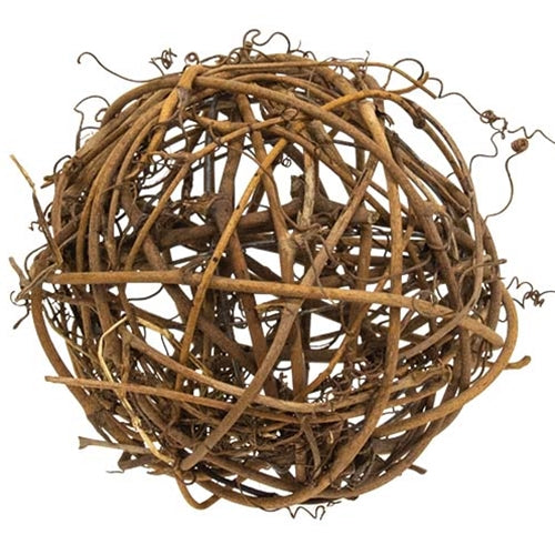 The Grapevine Twig Ball is a decorative sphere figurine made of layered, curled twig material in a natural brown color. This sphere brings a rustic, yet chic accent to the home, made to display inside of a bowl or rest atop a tray or shelf. Measures 4” in diameter.