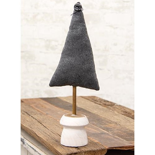 15.5" Gray Fabric Tree features heathered gray fabric, a distressed white, wooden base, and a dark, wooden dowel trunk. Tree is accented by a button and thread at the top and it pairs well with frosted winter florals, buffalo check decorations, or seasonal accessories. Measures 15.5" high by 5.75 wide by 3" deep.