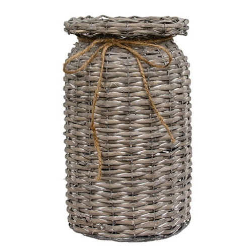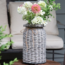 The Graywash Willow Milk Can Basket adds a versatile accent to decorative displays. Made with woven willow, the basket has a textured look and a gray finish. A metal wire frame supports the milk can-inspired shape, and the neck of the basket is accented by a jute string bow. Perfect for displaying planter stakes, floral arrangements, and other decor, the basket has a flat bottom for stable display on a shelf, tabletop, or floor. Measures 12” high by 7” in diameter.