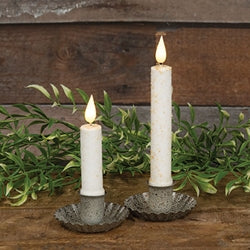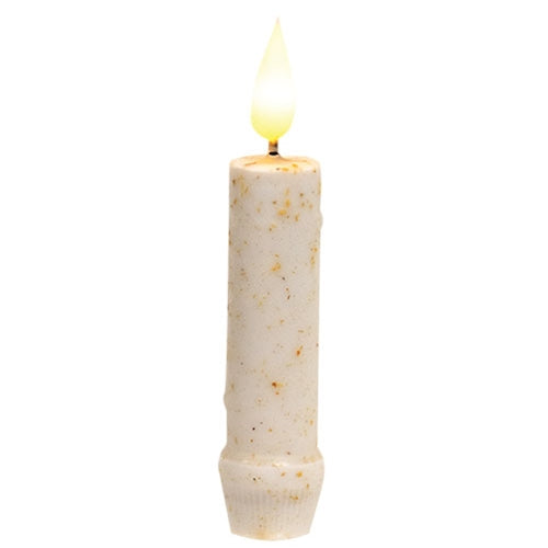 The Grungy White LED Timer Taper (shown at left) is a versatile electric taper candle crafted with a realistic look. Wax covers the candle, featuring a white color and textured beige flecks. An LED flame tops the candle and offers a natural-looking glow. The candle requires 1 AA battery, which is not included. A convenient switch on the bottom allows for an optional timer function that runs the candle for 6 hours on and 18 hours off. Measures 4.5” high by .75” in diameter.