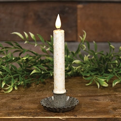 The Grungy White LED Timer Taper is a versatile electric taper candle crafted with a realistic look. Wax covers the candle, featuring a white color and textured beige flecks. An LED flame tops the candle and offers a natural-looking glow. The candle requires 2 AA batteries, which are not included. A convenient switch on the bottom allows for an optional timer function that runs the candle for 6 hours on and 18 hours off. Measures 6.25” high by .75” in diameter.