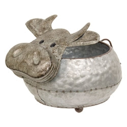 Please note: This Item features a variety of designs which are each sold individually (not as a set). Please add a note in your cart to indicate your preference. If no style is specified, one will be selected at random by our team. Hammered Metal Farm Animal Planters make a whimsical addition to a garden or decorative display. Crafted from galvanized metal with a distressed finish, each planter features a bowl-style body with a draining hole in the bottom. Visible seams and rusted edges give the planters a rustic look. One planter features a cutout, layered metal pig face with 4 stubby legs and a curled tail. One planter has a cutout layered cow face complete with a straight tail and 3 rounded feet. The pig planter measures 4.75” high by 5.75” wide by 9.25” deep, and the cow planter measures 6" high by 7.25” wide by 10” deep.