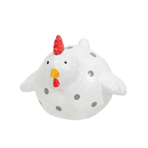 The Hen Plant Hanger is a unique decorative accent meant to hang over the edge of a planter, flower pot, basket, or bucket. Made from resin, the piece depicts a hen with a round body, wings, and tail feathers. The chicken’s defined head features a red comb and a yellow beak. A white finish with gray polka dots gives the hen a whimsical look. Measures 2.75” high by 3” wide by 3.25” deep.