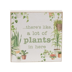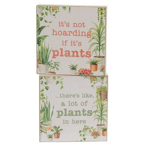 Please note: This Item features a variety of designs which are each sold individually (not as a set). Please add a note in your cart to indicate your preference. If no style is specified, one will be selected at random by our team (based on availability). The Hoarding Plants Block are an assortment of 2 humorous block signs - sold separately. Each square block is printed with illustrations of a lush, houseplant collection. One block says “it’s not hording if it’s plants” in a playful, peach-pink type. The other block reads “...there’s like, a lot of plants in here” in the same font and a green color. White sides and distressed edges offer a vintage touch. Display these blocks can be displayed freestanding on a table or shelf, or hanging on a wall using the pre-cut keyhole on the back during spring, or year-round. Blocks measure 4” high by 4” wide by 0.75” deep.