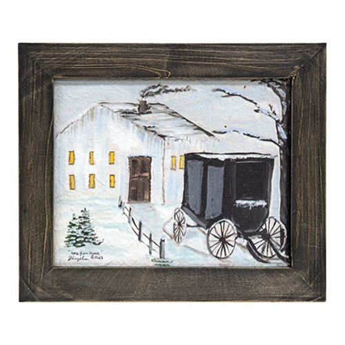 The Home from Church Textured Framed Print brings a cozy accent to farmhouse, rustic, or vintage inspired winter wall displays. Featuring a range of white, black, and brown tones with yellow and green accents, the print depicts a covered carriage parked in front of a house, accompanied by a bare tree, a fence, and a pair of evergreen trees. A unique textured finish makes the print more eye-catching. A wooden frame with an ashy hue and rustic, distressed look encases the print, and a pair of sawtooth hangers on the back allows for easy display. The print measures 8” high by 10” wide, and the frame measures 11” high by 13” wide by .5” deep.