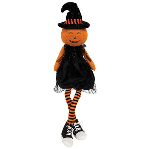 The Jack O Lantern Witch Dangle Leg Doll is a stuffed plush accent meant to dangle over the edge of a shelf or tabletop display. With a soft fabric finish, the figure features an orange jack o lantern head, orange arms, and long orange and black striped legs. She wears a black dress with a tulle overlay, a black pointed hat with an orange and black striped band, and black and white sneakers. Measures 30” high by 9” wide.
