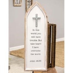 John 16 Cathedral Arch Sign is a wooden sign with a cathedral window design. Sign has a natural wood frame and cream background that reads, "in this world you will have trouble. But take heart! I have overcome the world - John 16:33" in black lettering. Sign is accented by a cross at the top and comes ready to hang for immediate display. Measures 36" high by 12" wide by .75" deep.