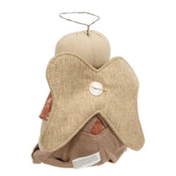 Joy the Inspirational Angel Boy is a charming country accent perfect for springtime or everyday decor. Finished with neutral canvas, the doll has a weighted body, round head, floppy arms, and dangling legs. A pair of canvas angel wings are attached to his back with a pearlescent button and beige thread. A wire halo adorns his head, and painted eyes and flushed cheeks give a friendly look. The doll wears a dusty red floral shirt and taupe overalls, each fastened by a pair of pearlized buttons. A brown paper tag is tied around the angel’s neck with a jute string, reading “joy.” Measures 7.5” high by 5.5” wide by 2.5” deep.
