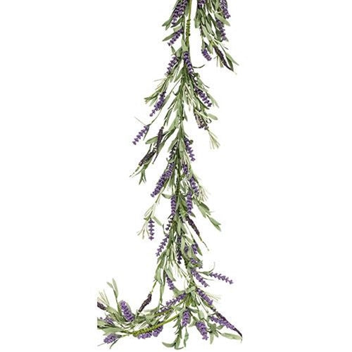 Lavender Herb Garland is a spring garland that features foam leaves and plastic lavender buds on a green paper-wrapped wire stem. Garland has a purple and green color scheme and it looks great draped across a mantel or shelf. Measures 5 feet across.