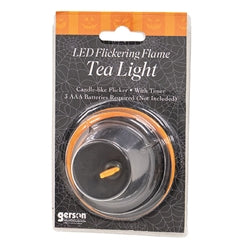 The LED Halloween Flickering Flame Tealight is a versatile must-have for fall or everyday decor. The tealight features a black base and an orange faux flame with a rubberized texture and precise shape. Powered by 3 AAA batteries, which are not included, the candle offers a warm glow and a realistic flicker. The convenient optional timer function runs the candle for 5 hours on and 19 hours off. Measures 2.5” high by 2.75” in diameter.