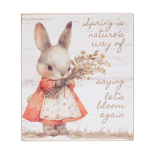 The Lets Bloom Again Bunny Block is a darling decorative sign for Easter or spring display. Printed design on the front of the block depicts a standing light gray bunny with tall ears wearing a layered white and coral dress. The bunny holds a bouquet of soft leaves and white blooms, and has a bashful expression on her face. Grass sits along the bottom of the design, and the background features a white woodgrain look. Beige script text reads “spring is nature’s way of saying let’s bloom again,” and a distressed finish gives the block a rustic look. The back of the block features a precut keyhole hanger for versatile display. Measures 6” high by 5.13” wide by .75” deep.
