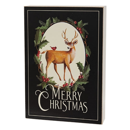 The Merry Christmas Deer & Cardinal Box Sign is an elegant accent for seasonal shelf, wall, or tabletop decor. Crafted from wood, the box sign features an open back for versatile freestanding or hanging display. The sign has a black painted finish with ivory painted sides. An elegant image adorns the sign, depicting a deer with a cardinal standing on its rump. The deer image is set on an off-white oval framed by green and red pine needles, holly leaves, and berries. White text across the bottom of the sign reads,” merry Christmas. Measures 11.5” high by 8” wide by 1.5” deep.