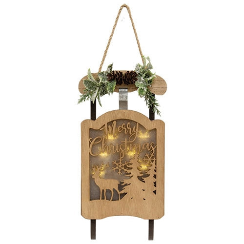 The Merry Christmas LED Sled Hanger is a detailed decorative accent for festive seasonal displays. Made from wood, the body of the sled features cutout design depicting a reindeer standing near a pair of evergreen trees. Snowflake cutouts accent the scene along with text that reads “merry Christmas.” Warm white LED accents add a cozy glow. The top of the sled is adorned with glittered faux greenery and small pinecones. A jute rope hanger allows for easy wall display. The sled requires 2 AAA batteries and measures 12” high by 5.5" wide by 1.5" deep.