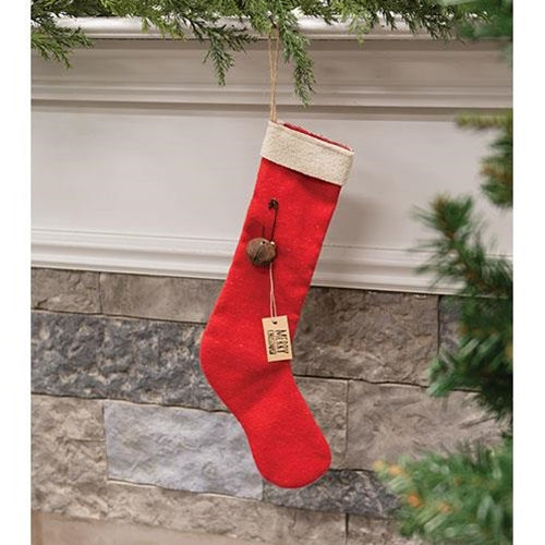 The Merry Christmas Stocking Ornament is a tall, thin stocking made of bright red fabric. The stocking features an ivory sherpa cuff, a rusted jingle bell pinned onto the front, and a brown paper tag with the message "Merry Christmas!". The top of the stocking includes a jute rope loop to use for a hanging display, on a tree bough or on a hook or nail on a wall or mantle. This stocking makes a great addition to primitive Christmas decor and can be displayed alone or stuffed with Winter florals and greenery. Measures 14" long by 7" wide.