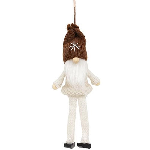 The Mini Brown & White Gnome is a decorative wooden and plush gnome doll figurine with white knit dangle legs. The gnome has a fuzzy white beard and wears an ivory knit sweater, as well as a brown knit beanie with a stitched snowflake design. The ornament includes a brown string hanger to use for display, bringing a whimsical, wintry touch to a Christmas tree during the holiday season. Measures 7” high by 3” wide by 2” deep.