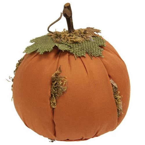 6.5" x 7.5" Mossy White Stuffed Pumpkin is a weighted fabric pumpkin with an orange finish. Pumpkin is accented by faux moss, a wooden stick stem with a curly dried vine tail, and brown and green burlap leaves and it looks great on counters and tabletops. Measures 6" high by 5" in diameter.