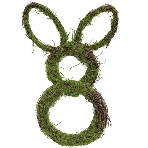 The Mossy Twig Bunny is a decorative bunny silhouette figurine made of bundled twig material in a natural dark brown color. The bunny is accented with green moss detailing, bringing a rustic woodland accent to the home, displayed hanging on a door or wall or propped on a shelf. Measures 13” high by 7” wide by 1” deep.