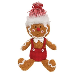 Please note: This Item features a variety of designs which are each sold individually (not as a set). Please add a note in your cart to indicate your preference. If no style is specified, one will be selected at random by our team (based on availability). Mr. and Mrs. Gingerbread are playfully festive figures perfect for winter holiday shelf or tabletop displays. The stuffed plush figures each depict a gingerbread cookie with a brown fuzzy finish. Available in 2 assorted styles, the Mr. Gingerbread doll wears red overalls, a white bowtie, and a red and white chevron hat while the Mrs. Gingerbread doll wears a red and white chevron dress with a red collar and red hair bow. White detail on each figure gives the look of piped icing. Each measures 18” high by 8.5” wide.