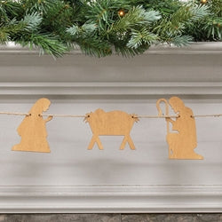Natural Wood Nativity Garland is a unique hanging piece made from wood with seasonal style. The garland features 11 nativity silhouettes on a jute twine string. A hanging loop at each end allows for easy display along a wall, window, or table. The garland measures 63" long.