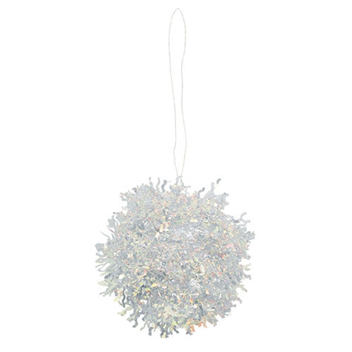 The Opalescent Tinsel Ball Ornament adds a shimmering accent to a holiday tree or hanging decor. With a white base, the spherical ornament features a textured tinsel finish. The tinsel has opalescent color that reflects light with subtle blue, purple, yellow, and pink hues. A clear string hanger allows the ball to easily hang. Measures 4.5” high by 4.5” in diameter.