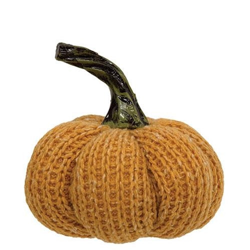 The Orange Knit Pumpkin is a decorative plush tabletop sitter. The pumpkin features a soft orange knit fabric and has a twisted brown resin stem. The pumpkin is made with a weighted bottom to ensure secure display on any flat surface and makes a great addition to autumnal décor. Display this pumpkin in a centerpiece, in a bowl as filler, on a bookshelf, or on a riser surrounded by other tabletop decorations. Measures 3.5” high by 4” in diameter.