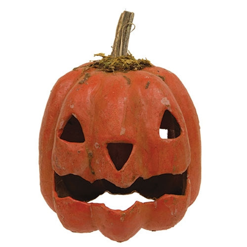 The Papier Mache Upside-Down Nose Mossy Jack Luminary is a unique Autumn decor piece made with rustic, primitive style. Made with an imperfect papier mache inspired design, the piece depicts an orange pumpkin carved with a jack o lantern face. A wooden stem tops the pumpkin, accented by dried moss. The bottom of the luminary is open for easy placement over an electric candle. Measures 8” high by 6” in diameter.