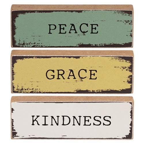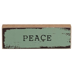 Please note: This Item features a variety of designs which are each sold individually (not as a set). Please add a note in your cart to indicate your preference. If no style is specified, one will be selected at random by our team. Peace Tiny Mini Sticks bring a thoughtful accent to rustic decor. Made from wood, the decorative sticks feature freestanding horizontal design. The sticks feature painted fronts and unfinished sides with a distressed effect. One stick is painted green and reads “peace,” one is yellow and reads “grace,” and one is white and reads “kindness.” Each measures 1” high by 3” wide by .5” deep.