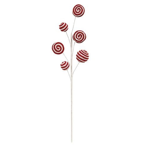 The Peppermint Ball & Lollipop Spray is a decorative spray with a flexible, white-wrapped stem. The spray has white-wrapped branches featuring plush ball and lollipop toppers, made of red and white striped and swirled fabric. This spray brings a fun and whimsical touch to Christmas décor in the home, displayed inside of a pitcher, can, or vase, alone or alongside florals and greenery. Measures 23.5” long (each topper measures approximately 2” in diameter).