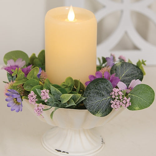 The Perfect Petals & Greens Ring adds a textured, colorful accent to everyday or springtime decor. The ring features fabric leaves and flowers, dainty foam florals, and plastic spiky florals and berries in shades of green and purple. The green-wrapped ring makes a great addition to a decorative vase or pillar candle display. Measures 3.5” in inner diameter and 10-12" in outer diameter.
