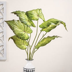 The Perilla Leaf Bush brings a fresh green touch to decorative displays. The bush features a full arrangement of large leaves sprouting from a green plastic stem. Detailed design with dimensional green coloring and subtle pink hints gives the leaves a realistic look. Measures 24” high by 18” in diameter.
