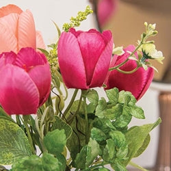 The Pink Tulips & Wildflowers in Metal Pot brings a fresh farmhouse accent to decorative displays. The realistic artificial plant rests in a cylindrical metal pot with a galvanized finish. Dried moss detail and plastic green stems sprout from the pot. The collection of flowers includes dark and light pink tulips, white wildflowers, and dimensional green leaves. The voluminous design features a variety of textures for a realistic look. Measures 8.5” high by 3” in diameter.