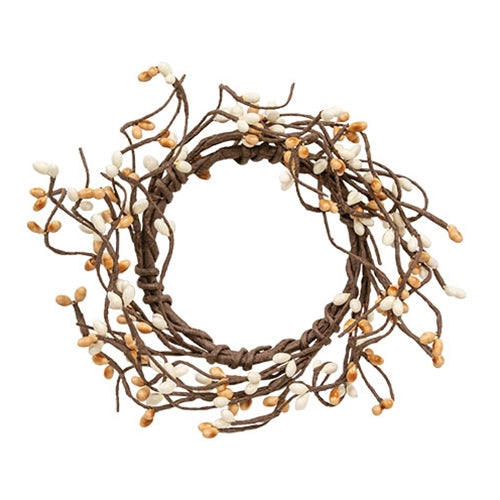 The Butter Cake Pip Berry Ring brings a textured, nature-inspired accent to fall, spring, or everyday decor. A brown-wrapped stem serves as the base for the ring and sprouts curly, brown-wrapped branches. Small faux berries in warm, neutral tan and cream shades adorn the ring. Flexible branches allow for versatile positioning and the ring fits around a candle or figurine less than 3.5” in diameter. Ring measures approximately 6-8” in outer diameter and 3.5” in inner diameter.