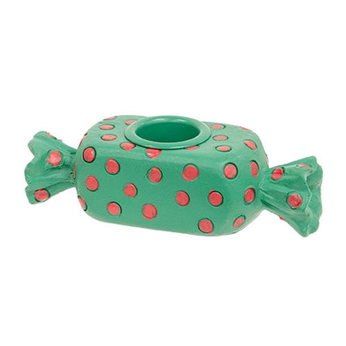 The Polka Dot Candy Taper Holder is an adorable accent for a winter holiday display. Crafted from resin, the taper candle holder features the shape of a rectangular wrapped candy with a green finish accented by red polka dots. The flat bottom of the candle holder allows for freestanding display, and the top features a round opening for an electric taper candle. Measures 1.5” high by 4.25” wide by 1.5” deep. Candle not included.