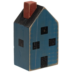 The Primitive Blue Wood House Block brings a simple, rustic accent to farmhouse decor. The block depicts a tall saltbox house in a rich blue color. Black painted details provide the look of a door, windows, and a roof. A weathered finish, distressed edges, and a burgundy chimney add a charming look. The block is freestanding for stable display on a flat surface. Measures 3.75” high by 2” wide by 1.5” deep.