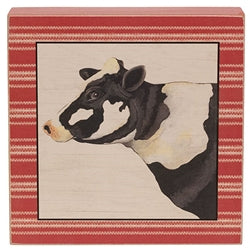Please note: This Item features a variety of designs which are each sold individually (not as a set). Please add a note in your cart to indicate your preference. If no style is specified, one will be selected at random by our team (based on availability). Primitive Farm Animal Portrait Box Signs bring a charming accent to kitchen or country decor. Each wooden box sign has a square shape with an open back for versatile hanging or freestanding display. Available in 3 assorted styles, one sign shows a cow, one shows a pig, and one shows a chicken. The designs have a vintage inspired style and art framed with a warm red and cream patterned border. Measures 6” high by 6” wide by 1.5” deep.