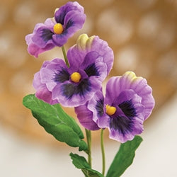 The Purple Pansy Pick accents faux floral arrangements with colorful, realistic style. A textured green stem sprouts a trio of green branches adorned with detailed green leaves. Bright faux florals featuring realistic purple and brown petals complete the pick. Measures 14” long by 4” wide by 2” deep.