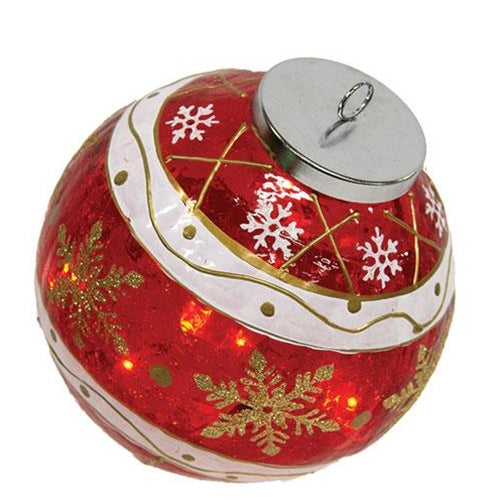 Red Stripe Snowflake Light Up Ball Ornament is a glass ornament with a festive red, white, and gold finish. Ornament is accented by embossed white and gold snowflakes and detailing and it comes ready to hang by a metal loop. Ornament casts a warm glow when turned on and it requires 3 AA batteries to operate (not included). Measures 6" in diameter.