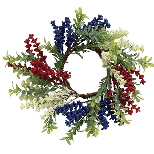 The Red White & Blue Heather Ring is a decorative floral candle ring with a natural, brown-wrapped base. The ring is filled with dusty boxwood greenery and features long stems of heather buds in cream, dark blue, and red. Pair this ring with a candle to dress up a riser, tray, or tabletop, or hang on a wall or door as a miniature wreath for a charming touch for the patriotic season. Measures 3.5” in diameter (inner) and approximately 10-12" in diameter (outer).