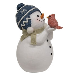 Resin Snowman with Blue Hat Holding Cardinal - 7"H