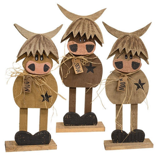 Rustic Wood Skinny Leg Highland Cow on Base 24" 3 Asstd.