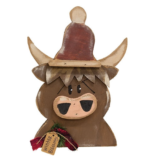 The Rustic Wood Winter Blessings Hanging Highland is a decorative hanger made with rustic layered wood. With a heavily distressed painted finish, the decor piece depicts the head and shoulders of a brown Highland cow complete with layered fringe. Black eyes and brows and a pink snout give the cow a friendly look, and he wears a red and white Santa hat. A sprig of faux greenery sits on his shoulder, accented by a red plaid ribbon and a brown paper tag that reads, “winter blessings.” Jute twine affixed to the back allows for hanging display on a wall or door. Measures 18” high by 12.5” wide by 2.5” deep. Made in the USA!