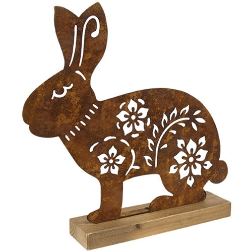 Rusty Metal Flower & Vine Cutout Bunny on Wooden Base