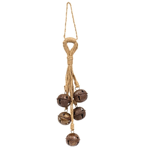 The Rusty Jingle Bell Teardrop is a decorative hanging piece made with a knotted jute rope base. The teardrop features five festive jingle bells made of rusty tin material, making this piece perfect for the Winter and Christmas season. Display this teardrop on a Christmas tree, frame, shelf, or other space in the home using the jute hanger at the top. Measures 14 in. long, bells measure 2 in. in diameter.
